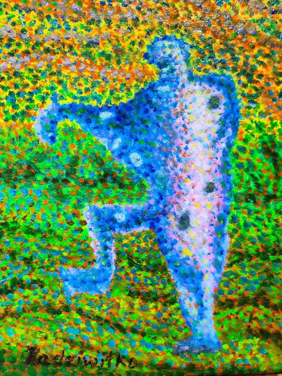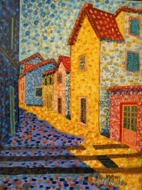 plamki i kropki. Rysuje też w tuszu. Tematyka obrazów to architektura oraz prace dotykające ekspresji i surrealizmu. Pracuje w IV LO w Lublinie ucząc